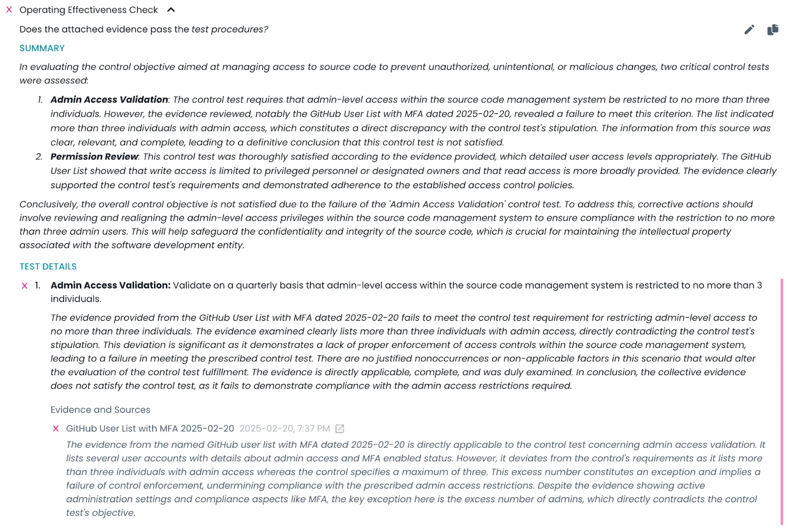 For example, suppose an organization has a control with two tests and three pieces of evidence. The operating effectiveness (OE) check will now explain, for each test, the overall result, a summary of the reasoning and then identify which pieces of evidence were applicable for the test and the individual evidence results and reasoning. It will look like this: