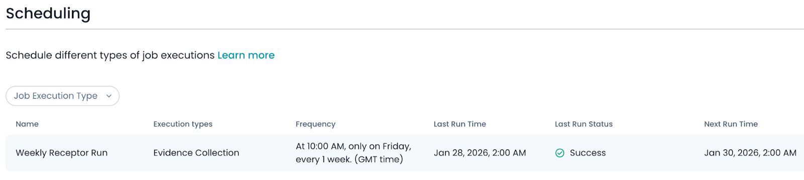 This release introduces flexible scheduling for evidence collection, control examination and test, or both on a shared schedule. Schedules can be configured to run hourly, daily, weekly, monthly, quarterly, or annually.