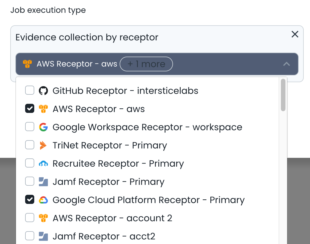 This option lets you collect evidence based on the type of receptor. Any receptor enabled in your account of the specified type will be run with the scheduled job, including receptors configured after the schedule is created.