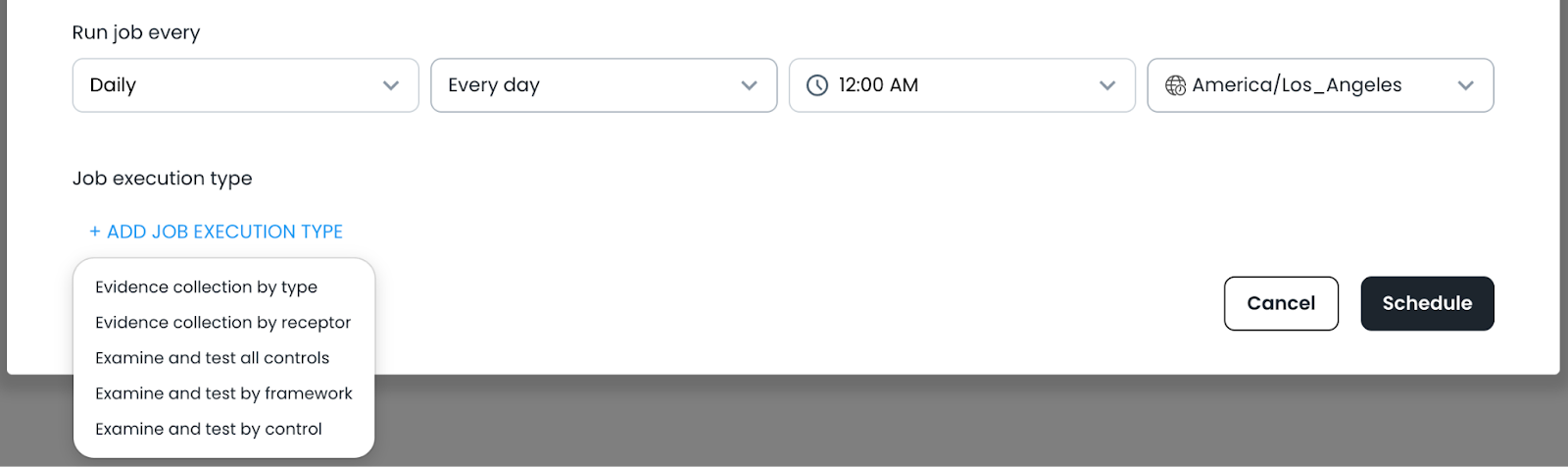 Schedules can currently be set to collect evidence, and / or examine and test controls. If both evidence collection and control evaluation are selected together in a schedule, evidence collection will always run first.